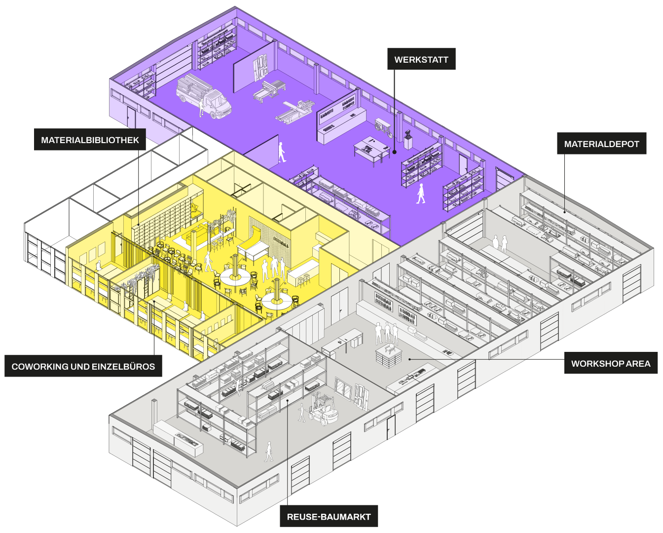 Der Bauwendehof zeigt, wie Kreislaufwirtschaft im Bau praktisch funktioniert. Er ist ein Ort, an dem Handwerk, Design und Planung zusammenkommen, um zirkuläre Bauweisen auszuprobieren und umzusetzen. Hier zählt nicht die Theorie, sondern das Tun. In Werkstätten, Kommunikationsflächen und Materiallagern werden Materialien erprobt, weiterverwendet und zu neuen Projekten verarbeitet. Ziel ist, Ressourcen zu erhalten, Wissen in Wert zu verwandeln und den Innenausbau nachhaltig zu gestalten. Der Bauwendehof ist offen für alle, die aktiv mitgestalten wollen – Handwerker:innen, Designer:innen, Architekt:innen und Ingenieure. Wer hier arbeitet, lernt, teilt und experimentiert, trägt direkt dazu bei, die Bauwende praktisch zu leben.